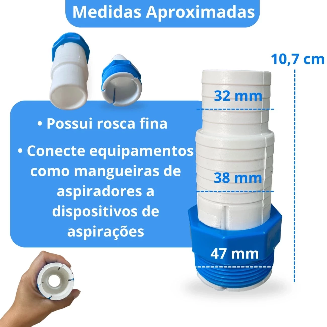 - Esse acessório é projetado para conectar equipamentos, como mangueiras de aspiradores de piscina a dispositivos de aspiração.