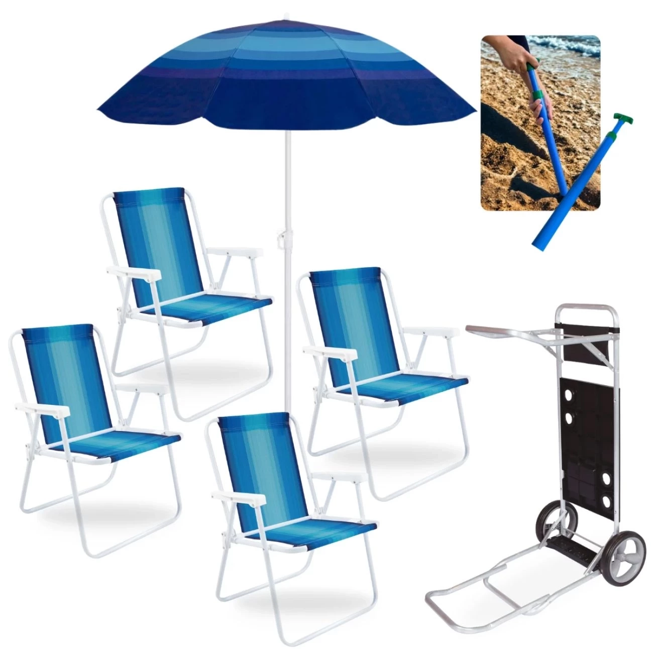 Kit 4 Cadeiras de Praia em Aço + Carrinho com Avanço + Guarda Sol Fashion 1,50 M + Saca Areia Parque