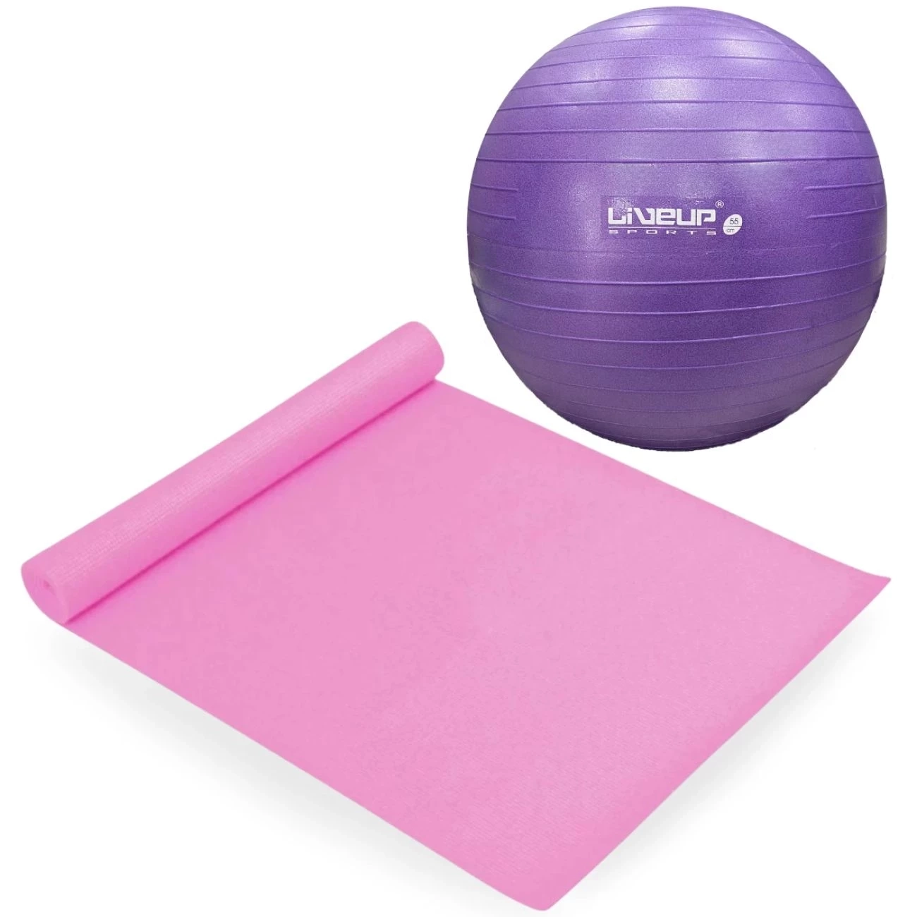 Kit Bola Anti Estouro Pilates Roxa 55 Cm + Bomba Inflar + Colchonete Rosa 1,73m Academia Treino Yoga