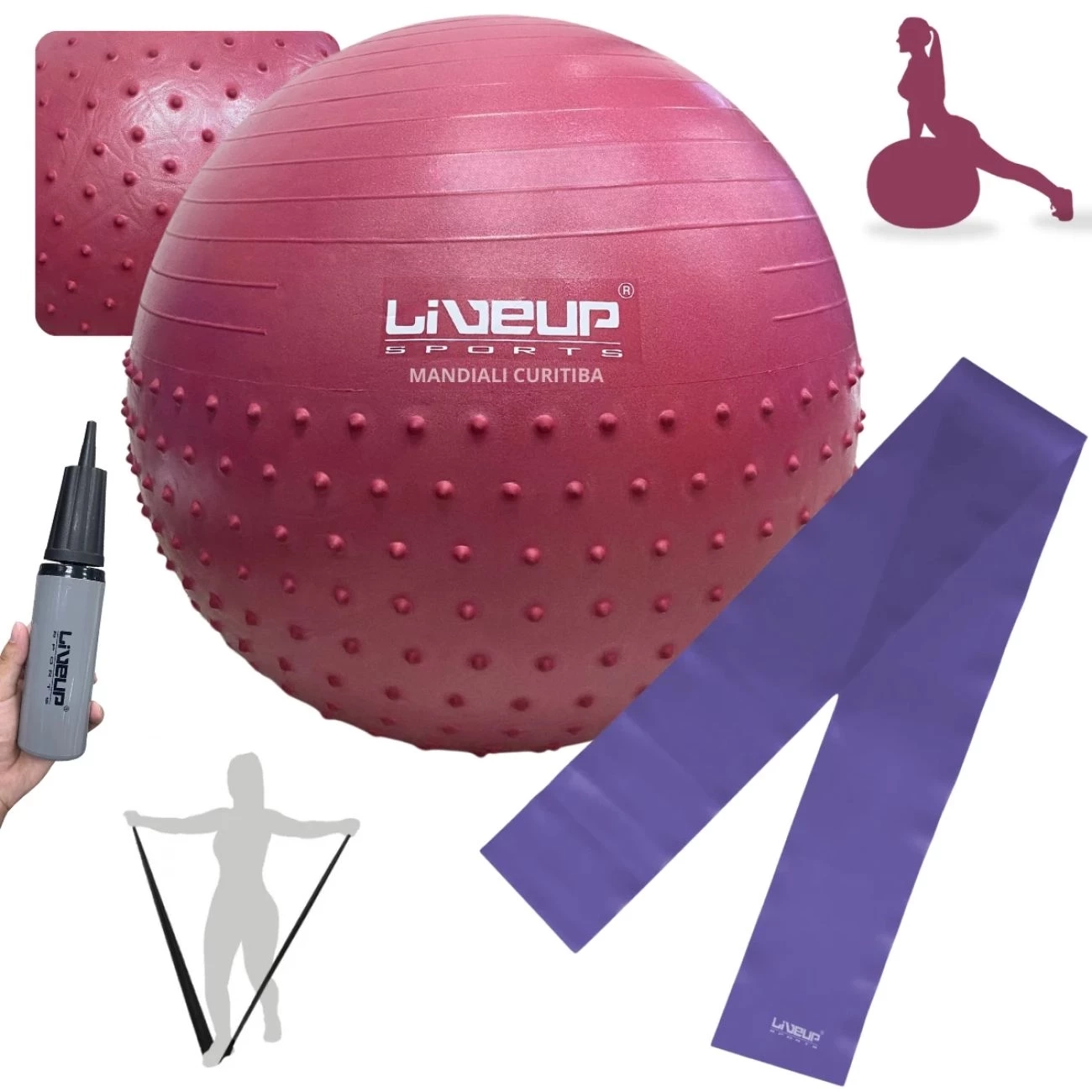 Kit Bola Suiça 65cm de Pilates Textura Cravo Massage Ball + Mini Bomba + Faixa Elástica em Látex Tensão Média