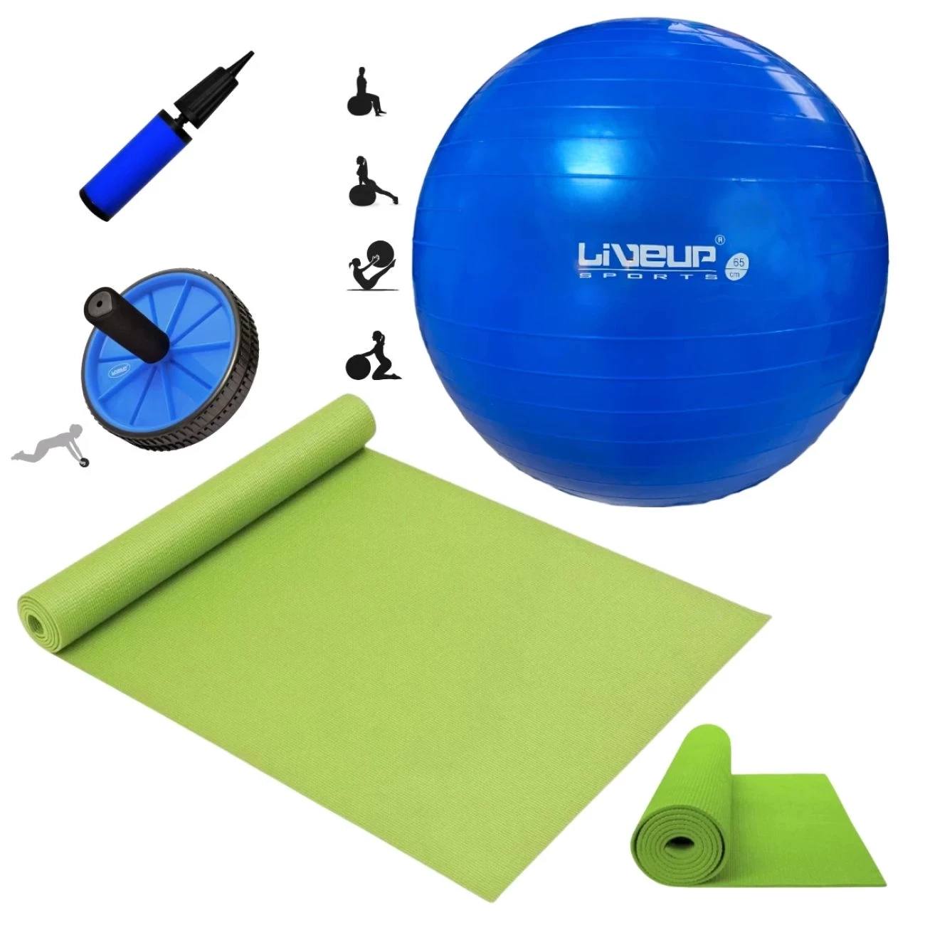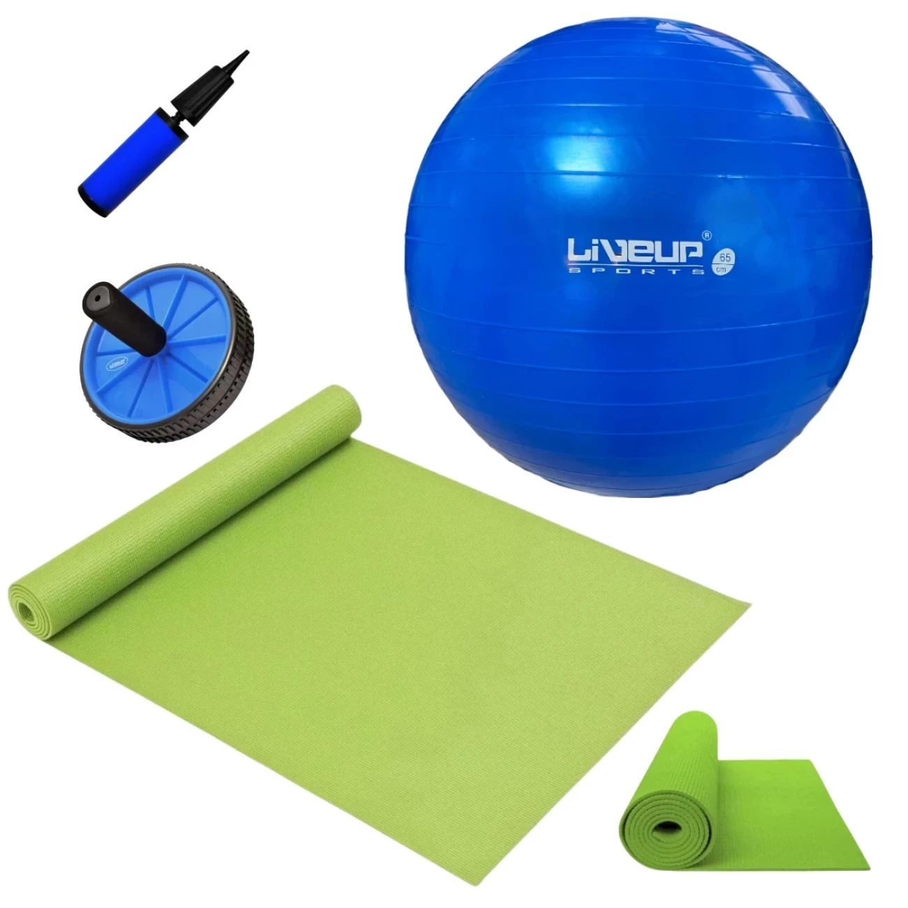 Kit Bola Suiça 65cm + Mini Bomba + Roda Abdominal + Colchonete Verde para Pilates, Yoga e Treino