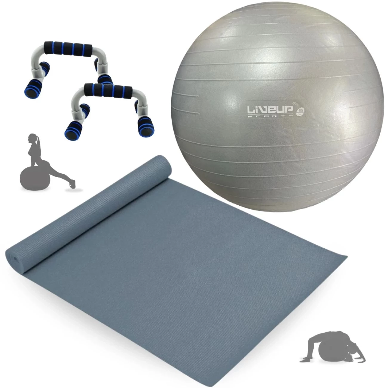 Kit Bola Suíça Premium Yoga Cinza 85cm + Apoios para Flexão + Colchonete 1,73m + Bomba Inflar Treino