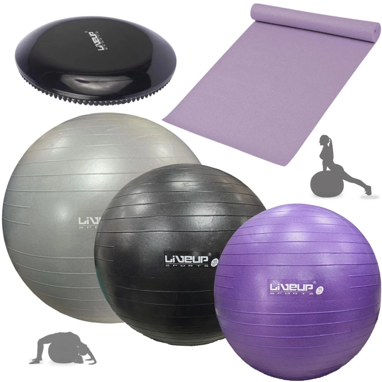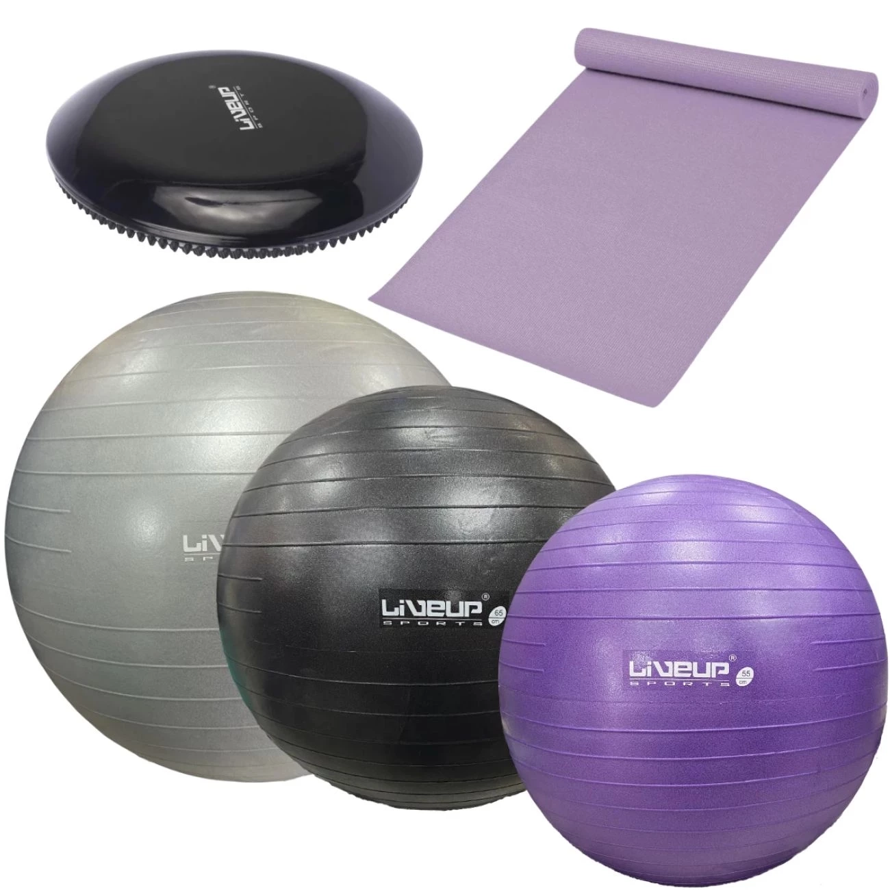 Kit Bolas Yoga Roxa 55cm + Preta 65cm + Cinza 85cm + Tapete 1,73m + Disco Equilíbrio + Bomba Inflar