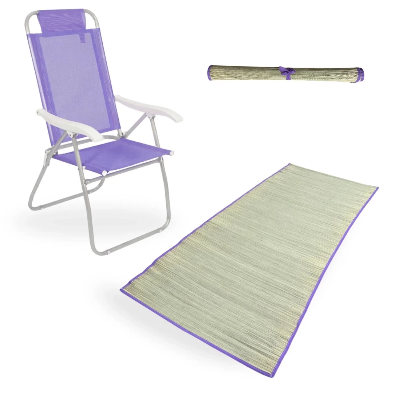 Kit Cadeira Prosa 4 Posições Alta Alumínio + Esteira de Praia Roxa em em Palha