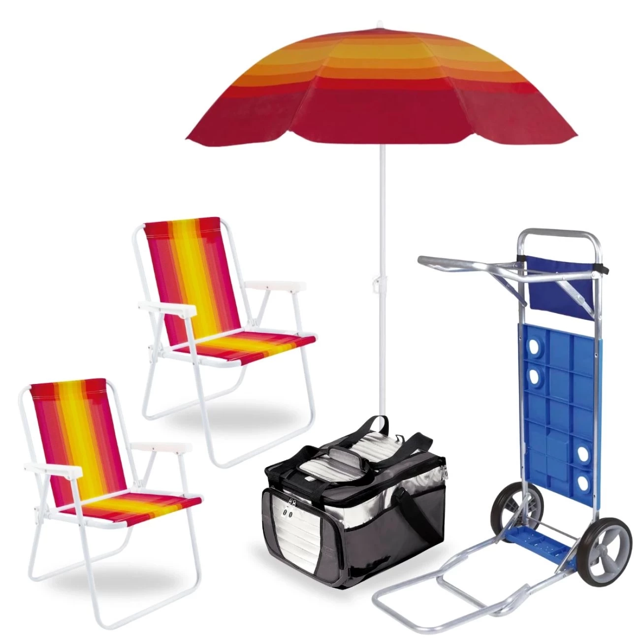 Kit Carrinho de Praia com Avanço + Guarda Sol 1,50 M + 2 Cadeiras Alta de Aço + Bolsa Térmica 36 L