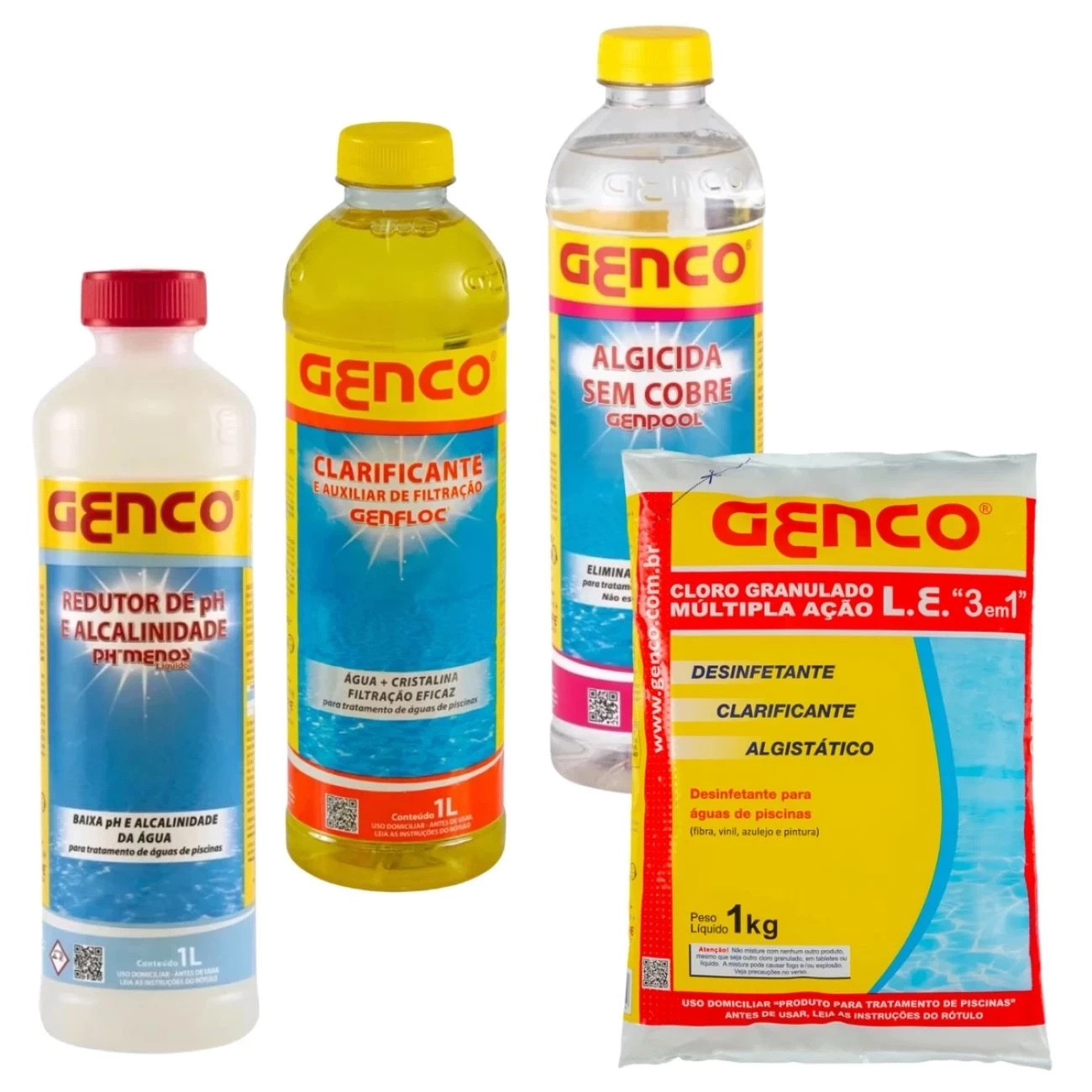 Kit Cloro Granulado 1kg + Clarificante + Algicida + Redutor de Ph e Alcalinidade