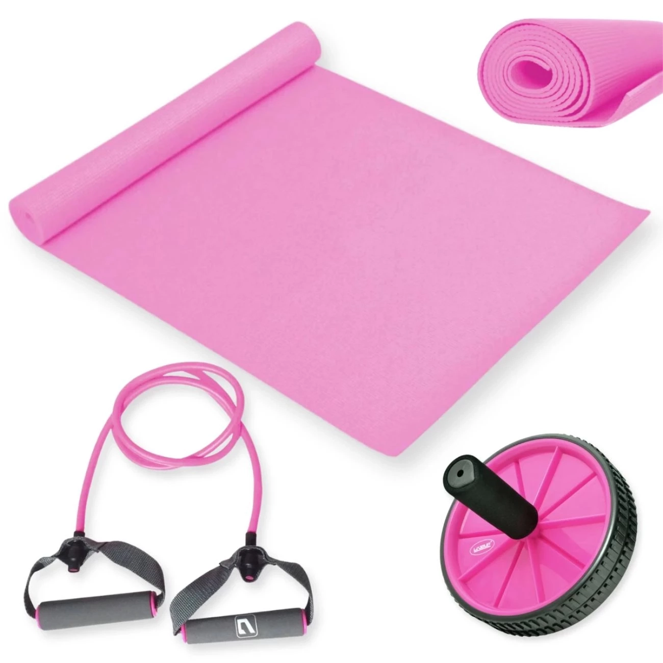 Kit Colchonete Eva Rosa + Extensor Elástico Tensão Leve + Roda Abdominal Yoga / Pilates