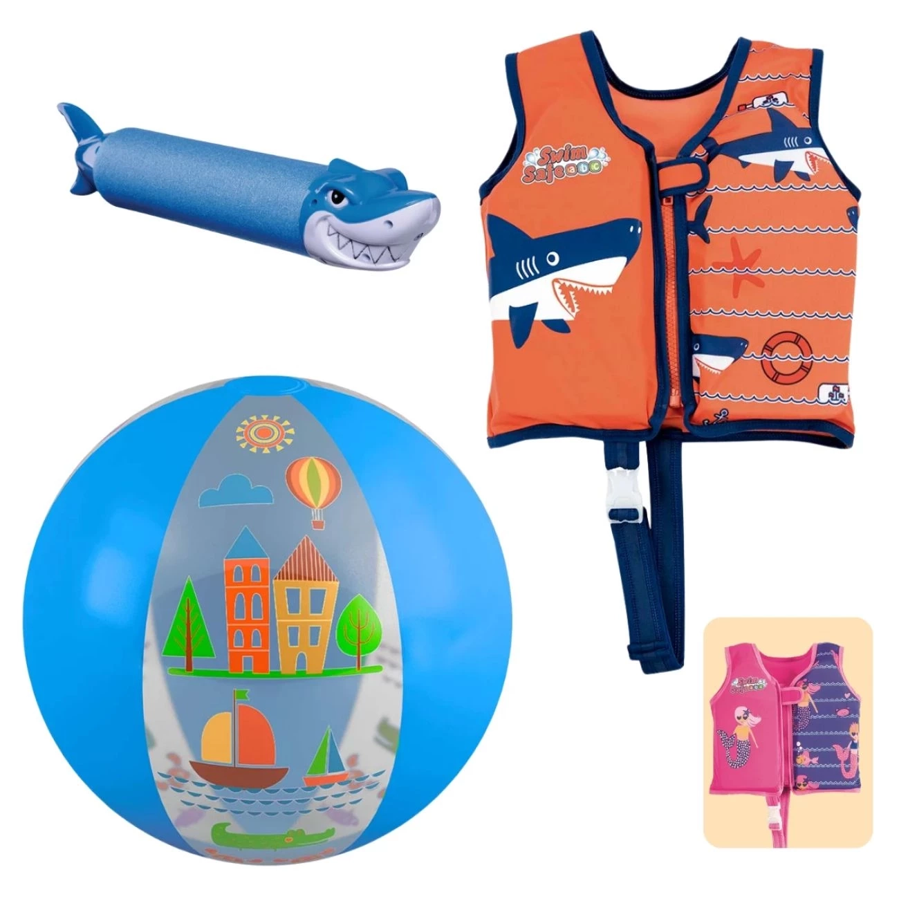 Kit Colete Infantil Natação Tamanho P/M + Bola 40 Cm e Lança Água Piscina Praia