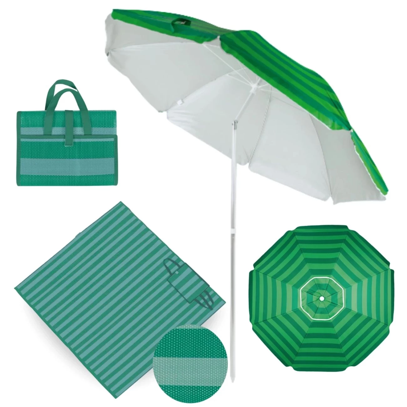 Kit Guarda Sol 2,40m Articulado + Esteria de Praia de Casal 2,0m X 1,5m Verde Listrado