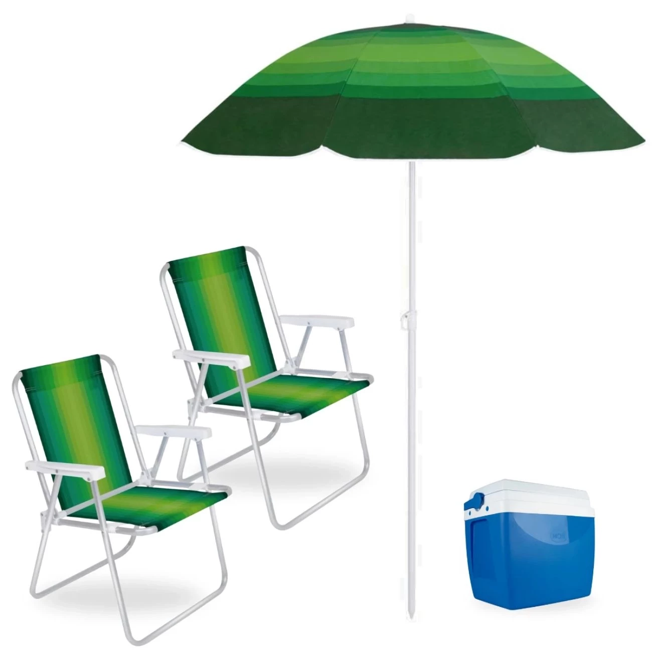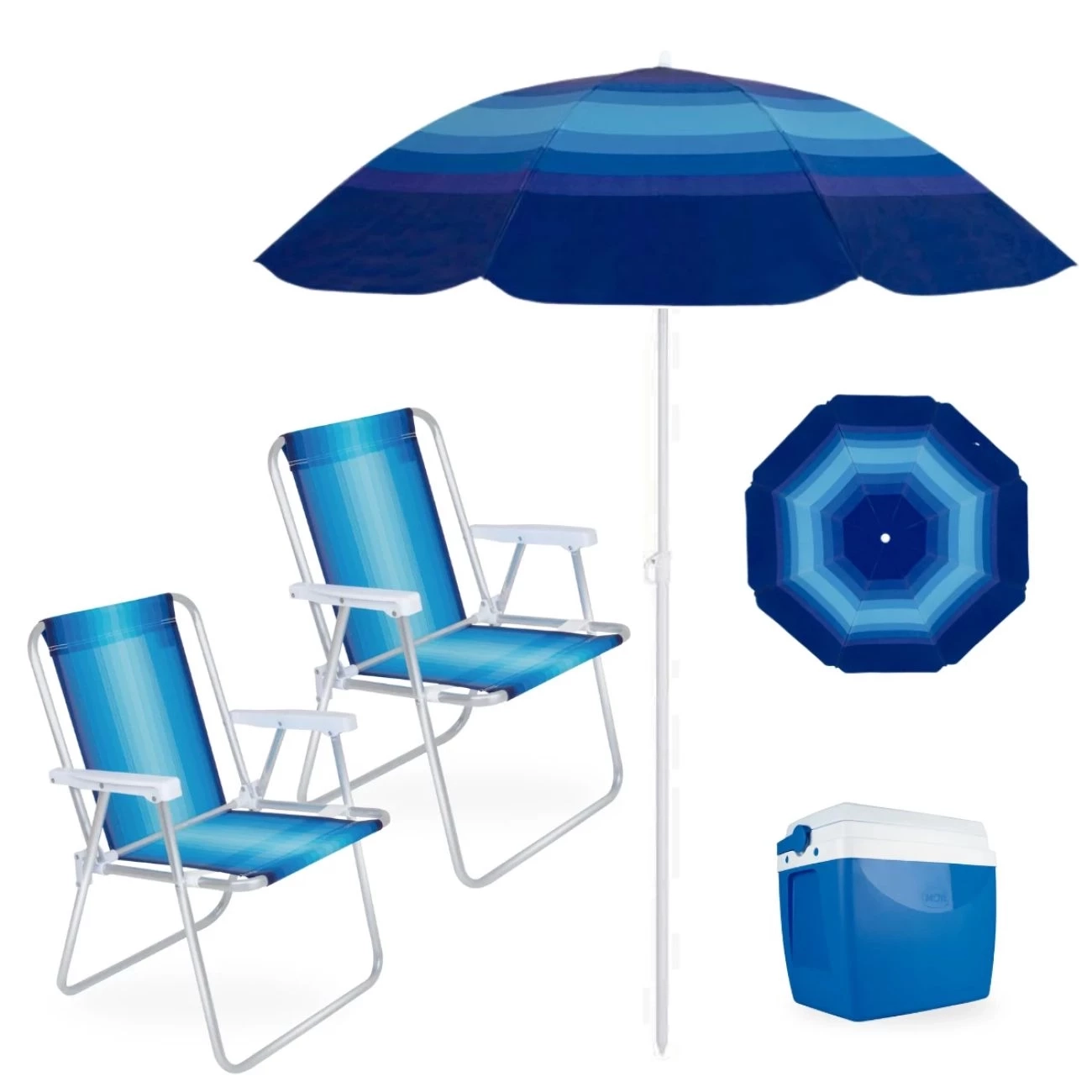Kit Guarda Sol Fps 70 1,50 M de Aço + 2 Cadeiras de Praia Alta Alumínio + Caixa Térmica 12 Litros