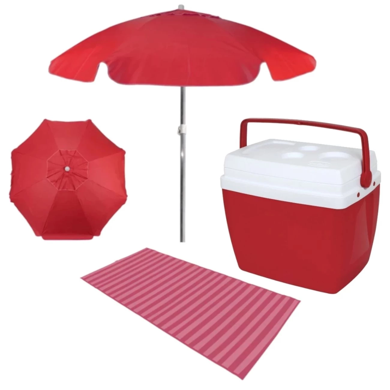 Kit Guarda-sol Vermelho 1,60m + Caixa Térmica 26 L + Esteira 1,80 M
