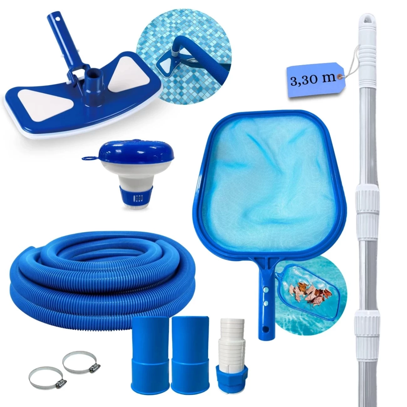Kit Limpeza de Piscina Peneira + Mangueira 6 M 38 Mm + Haste 3,30 M + Aspirador + Mini Flutuador