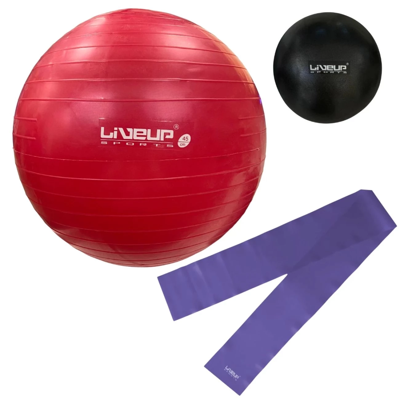 Kit Pilates Bola Suíça 45cm Vermelha + Overball 25cm Preta + Faixa Elástica Média para Treino Yoga