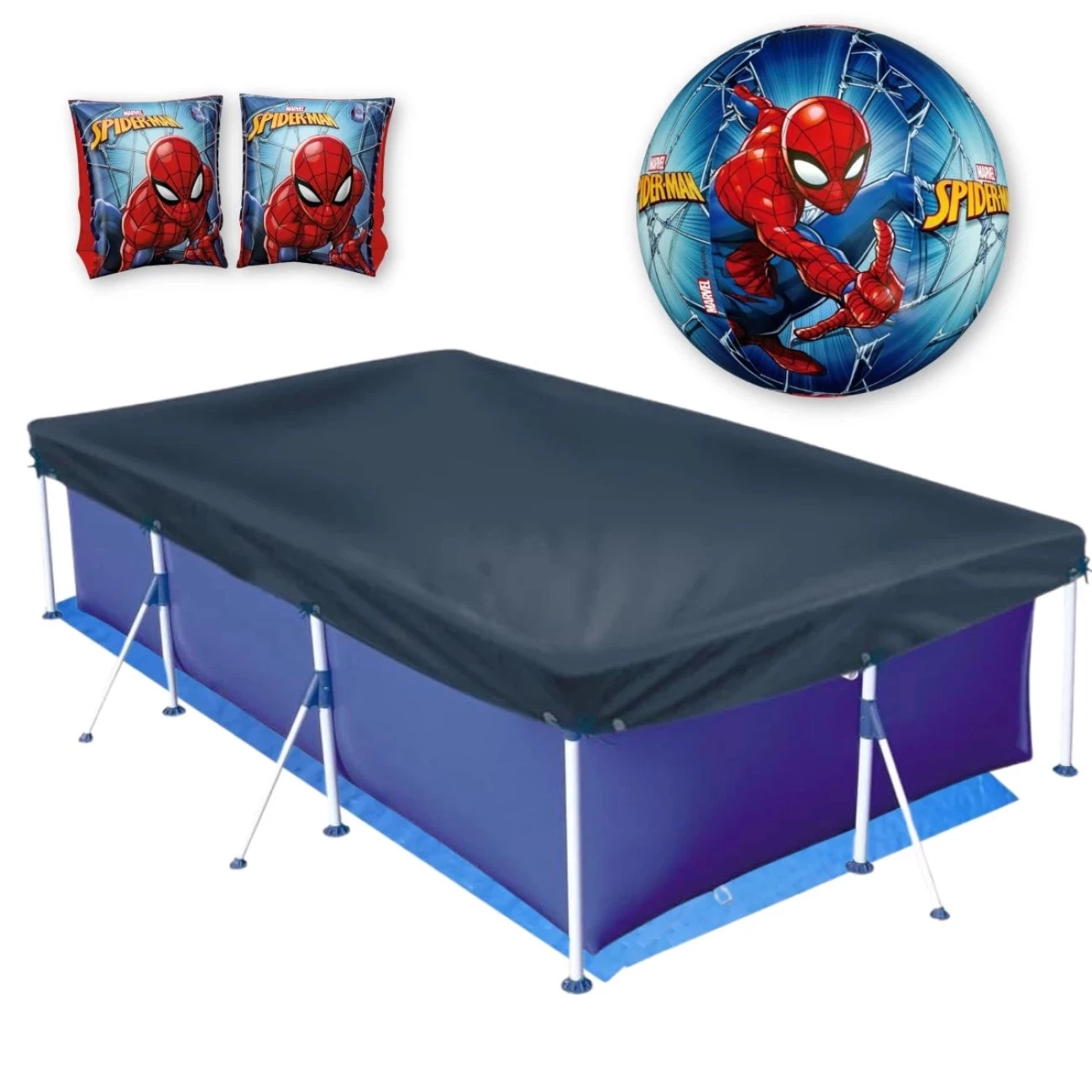 Kit Piscina 3700 L + Capa e Forro Mor + Boia e Bola Homem Aranha
