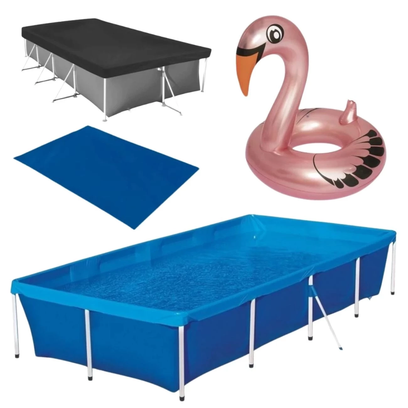 Kit Piscina de Armação 3000l + Capa + Forro + Boia Cisne Rosa